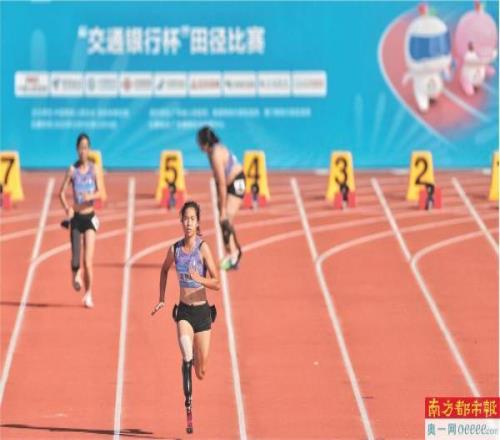 女子100米T64级决赛,广东运动员蒋艳红以14.99秒的成绩夺冠。