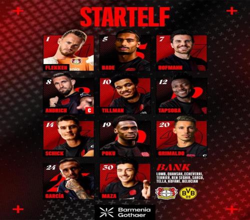 勒沃库森vs多特:希克PK吉拉西阿德耶米、萨比策首发