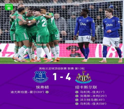 北京时间11月30日英格兰足球顶级联赛 联赛 第13轮,埃弗顿主场对阵纽卡斯尔联。埃弗顿迪尤斯伯里-霍尔破门。纽卡斯尔联马利克-佳夫梅开二度,刘易斯-米利破门,沃尔特马德破门。最终比分埃弗顿 1-4 纽卡斯尔联。