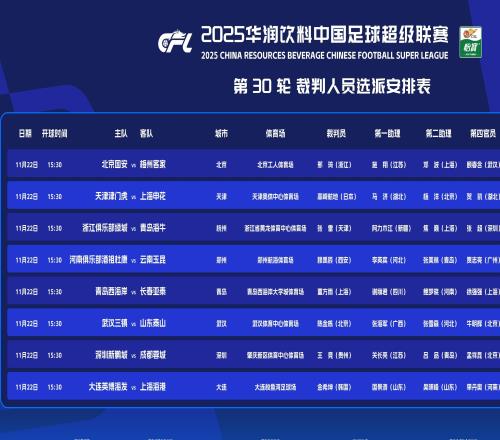 北京时间11月22日,中国足协公布中超最后一轮裁判安排:韩国籍裁判执法海港客战英博,日本籍裁判执法申花客战津门...